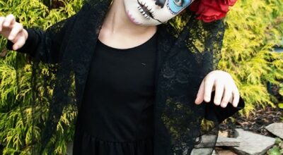 > De Novia cadáver: si tienes mano para el maquillaje este será el elemento central del disfraz que te proponemos. Una camiseta y una falda negra, y unas flores rojas a modo de diadema en su cabeza completarán el resto de su indumentaria. El maquillaje de la cara será lo más importante como decimos, te puedes inspirar en la imagen que te mostramos aquí mismo y sino, en internet encontrarás millones de ideas más.