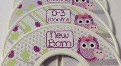 ¿Y te has fijado en el gorrito del bebé? Está hecho a partir de la manga ancha de una camiseta. Solo tendremos que recortarla y hacer un nudo para cerrar el gorro y que guarde el calor. Al margen de las prendas de ropa, una de las iniciativas que más nos han gustado, ha sido la de reciclar viejos CD’s y convertirlos en separadores para la ropa de su armario según su talla y edad.