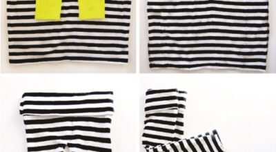 A partir de una antigua camiseta y cortándola según el patrón que ves en la imagen, podemos obtener un body fresquito para que nuestro bebé ande por casa. Lo mismo ocurre si utilizamos una antigua falda: tenemos la opción de transformarla en unos leggins infantiles.
