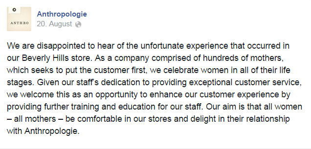 Lamentamos escuchar la desafortunada experiencia que ocurrió en nuestra tienda de Beverly Hills. Como compañía con cientos de empleadas madres, y anteponiendo siempre al cliente, celebramos ser mujer en todas las etapas de la vida. Dado el compromiso de nuestros empleados por prestar siempre la atención adecuada al cliente, vamos a aprovechar esta oportunidad para mejorar la experiencia del cliente ofreciendo una mayor formación y educación a nuestros empleados.