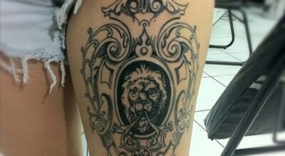 Tatuajes para muslos y piernas. Tatuaje de estilo heráldico en el muslo.