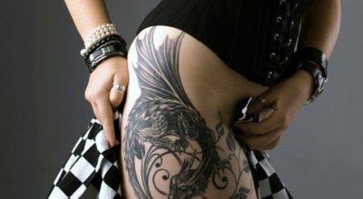 Tatuajes para muslos y piernas. Maxi tatuaje que va desde el muslo y sube hacia el costado.