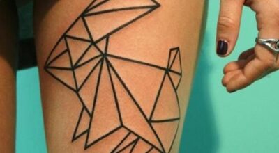 Tatuajes para muslos y piernas. Conejo hecho con formas geométricas en la parte delantera del muslo.