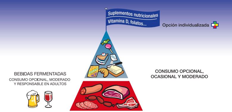 Por último, en la parte más alta de la pirámide, se sitúan los alimentos que debemos tomar con moderación. Se trata de aquellos procesados, con altos niveles de azúcar o grasas saturadas. Las carnes rojas y los embutidos deberían aparecer ocasionalmente en nuestra dieta. En cuanto a las grasas untables, como la mantequilla, lo ideal es elegir aquella sin sal añadida. Las bebidas alcohólicas deberían ser de baja graduación y de buena calidad. En cuanto a la cantidad, si hablamos de copas de vino, lo ideal es que los hombres no tomen más de dos ni las mujeres más de una al día.