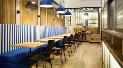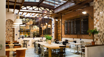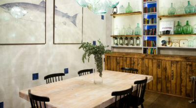 Una vez que entramos dentro, nos sorprende su comedor, de techos altos, una maravillosa luz natural que entra por las cristaleras de su techo y una decoración cuidada al milímetro. Las franjas azules y blancas que nos anticipan el ambiente marinero en su entrada, se reproducen dentro en azulejos, vajillas y otros elementos decorativos. Un comedor que se inspira en una lonja gallega con un punto chic y que, con ese matiz de sofisticación, nos ofrece los mejores productos que se venden en ellas.