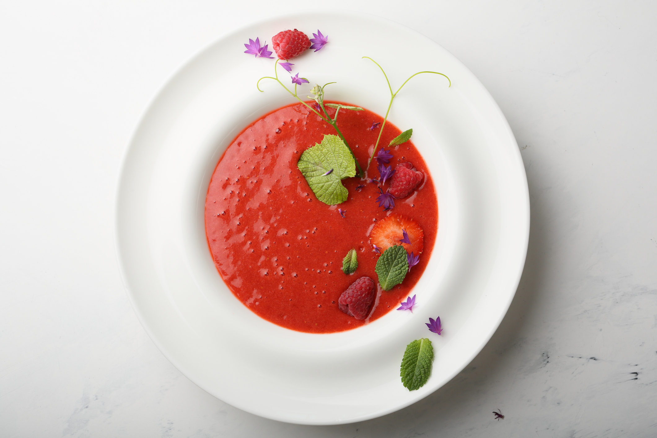 - Puedes decorar el gazpacho con unas gotitas de aceite y con una ramita de hierbabuena o menta, que además de dar más color al plato, también lo aromatizará.