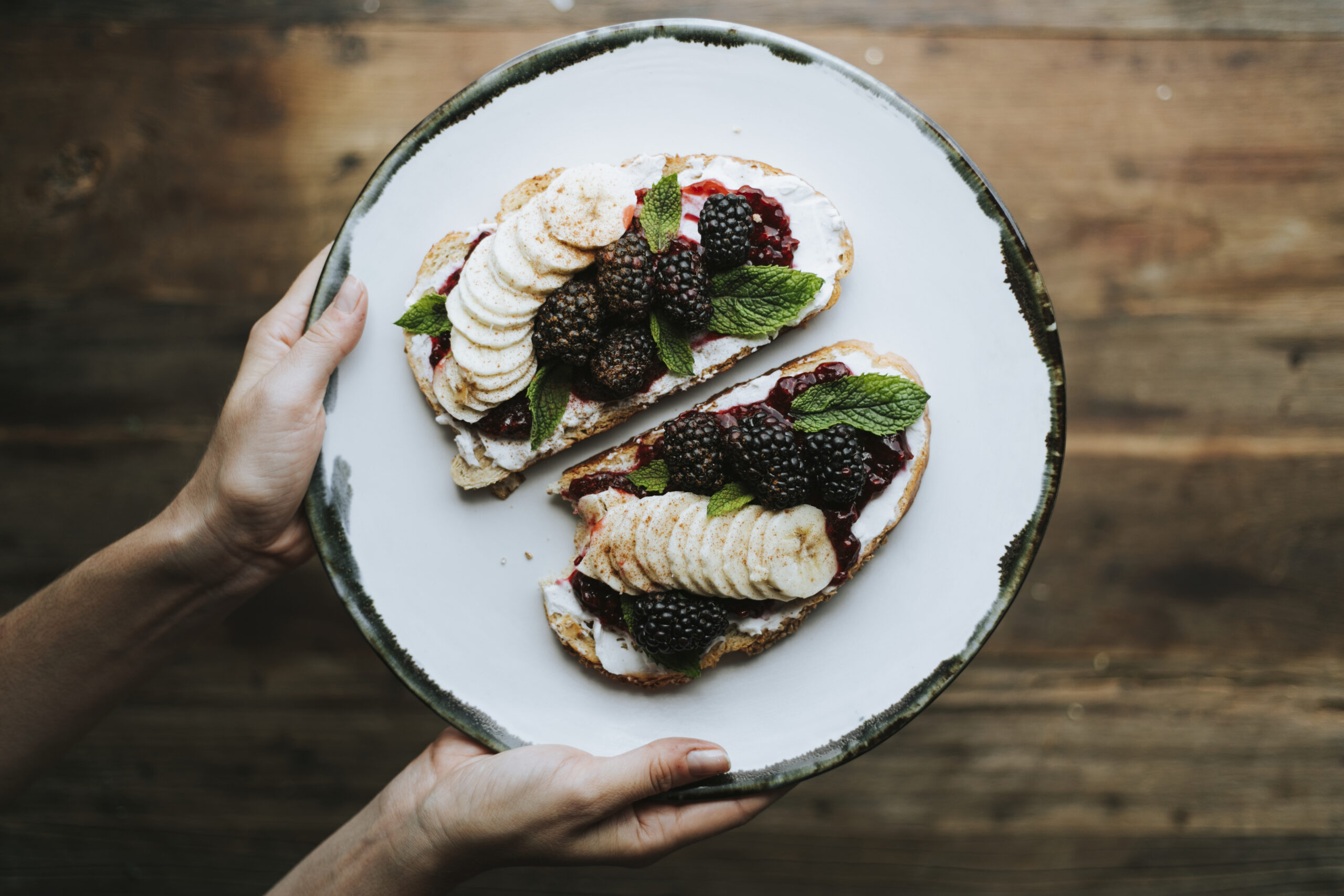 Tostada de mermelada de moras, plátano y queso de untar
