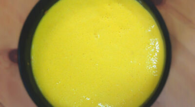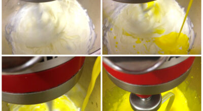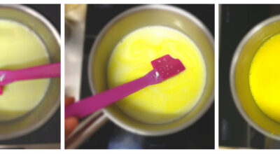 Mientras tanto, vierte la nata para montar en un cazo junto con el azúcar y llévalo a punto de ebullición o hasta que el azúcar se haya disuelto. Mientras se enfría, añade una pizca de colorante alimentario en pasta de color amarillo y mezcla hasta que el color de tu preparación sea homogéneo. Si deseas un color más intenso, sólo tienes que añadir más cantidad de colorante. Cuando lo tengas listo, deja enfriar tu preparación.