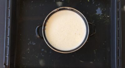 Vierte en la flanera o la olla pequeña y ponlo a cocinar al baño maría en el horno precalentado a 190º durante 45 minutos. Comprueba la cocción con un palillo o brocheta pinchando en el centro del flan. Si el palillo está limpio el flan estará listo.