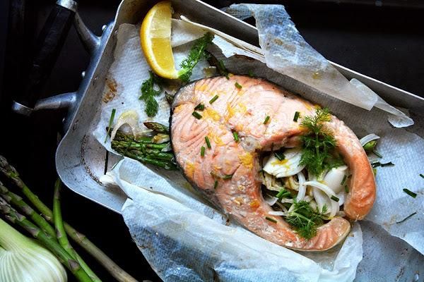 Aparte, salpimentamos las rodajas de salmón y agregamos eneldo al gusto. Colocamos cada una de las rodajas sobre el lecho de verduras que hemos preparado. Rociamos con un chorrito de vino y aceite de oliva y cerramos bien cada paquete. Dejamos hacer en el horno durante unos 15 o 20 minutos.