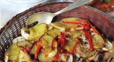 Cuando lo tengamos todo en la bandeja del horno, agregamos un chorro abundante de vino blanco. Después, llevamos al horno y mantenemos en él durante 45 minutos a 180º. Cuando está cocinado, podemos utilizar el grill para que se dore la parte superior y tenga un aspecto más apetitoso.