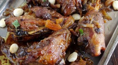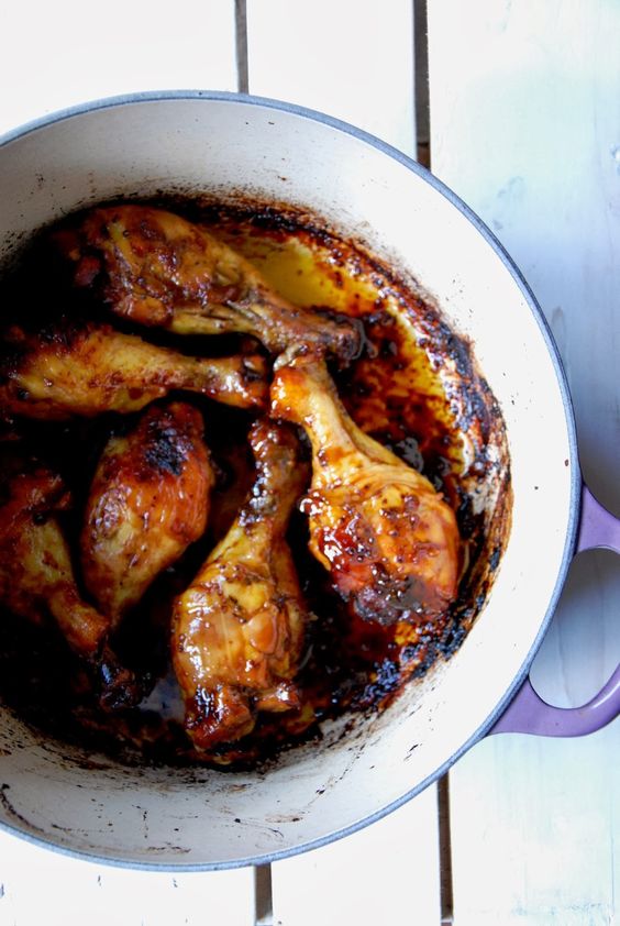 Al día siguiente, calentamos el horno a 190º y colocamos en la bandeja del horno el pollo con su salsa. Con ayuda de una brocha, barnizamos los muslos con miel para que se doren ligeramente. Dejamos hacer 20 minutos y damos la vuelta para que se hagan por ambas partes.