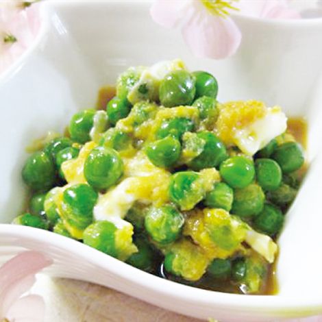 Ponemos el agua a hervir con una pizca de sal y cuando entre en ebullición, dejamos cocer los guisantes durante 5 minutos. A continuación, escurrimos y echamos un un chorrito de agua fría. Después, en una sartén calentamos la salsa de soja y cuando esté bien caliente agregamos los huevos batidos y los guisantes. Removemos sin parar y cuando el huevo empiece a cuajarse, retiramos del fuego, añadimos un chorrito de vino blanco y una cucharadita de miel y removemos todo para integrar bien estos ingredientes.