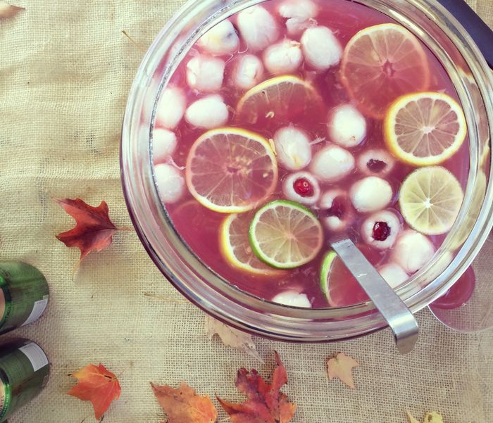 Para una presentación y una preparación arrolladora, mezcla varios tipos de ingredientes y diferentes zumos de frutas en una jarra transparente.