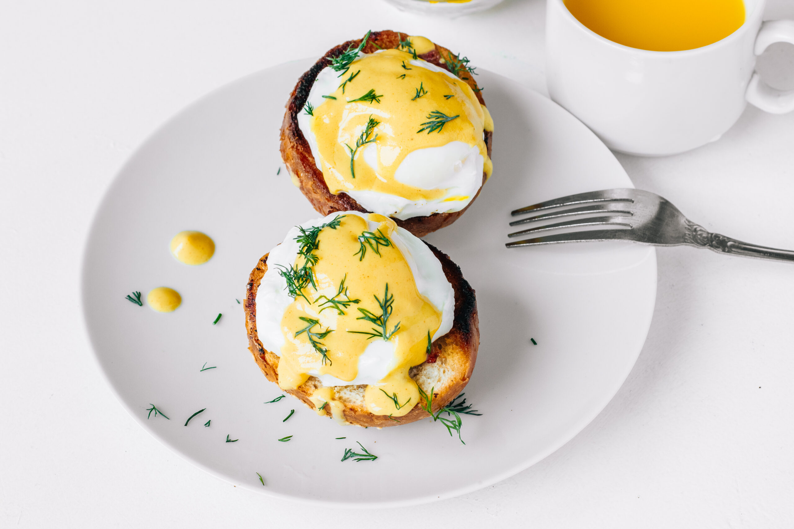 Para la salsa holandesa solo tienes que añadir todos los ingredientes en la batidora y triturar hasta obtener una crema ligera. Ajusta el sabor con sal y pimienta y vuelve a triturar hasta que quede más espesa. Por último añade esta salsa a las tostadas con huevo. Cuando rompas la yema y lo mezcles con la salsa, ¡salivarás!