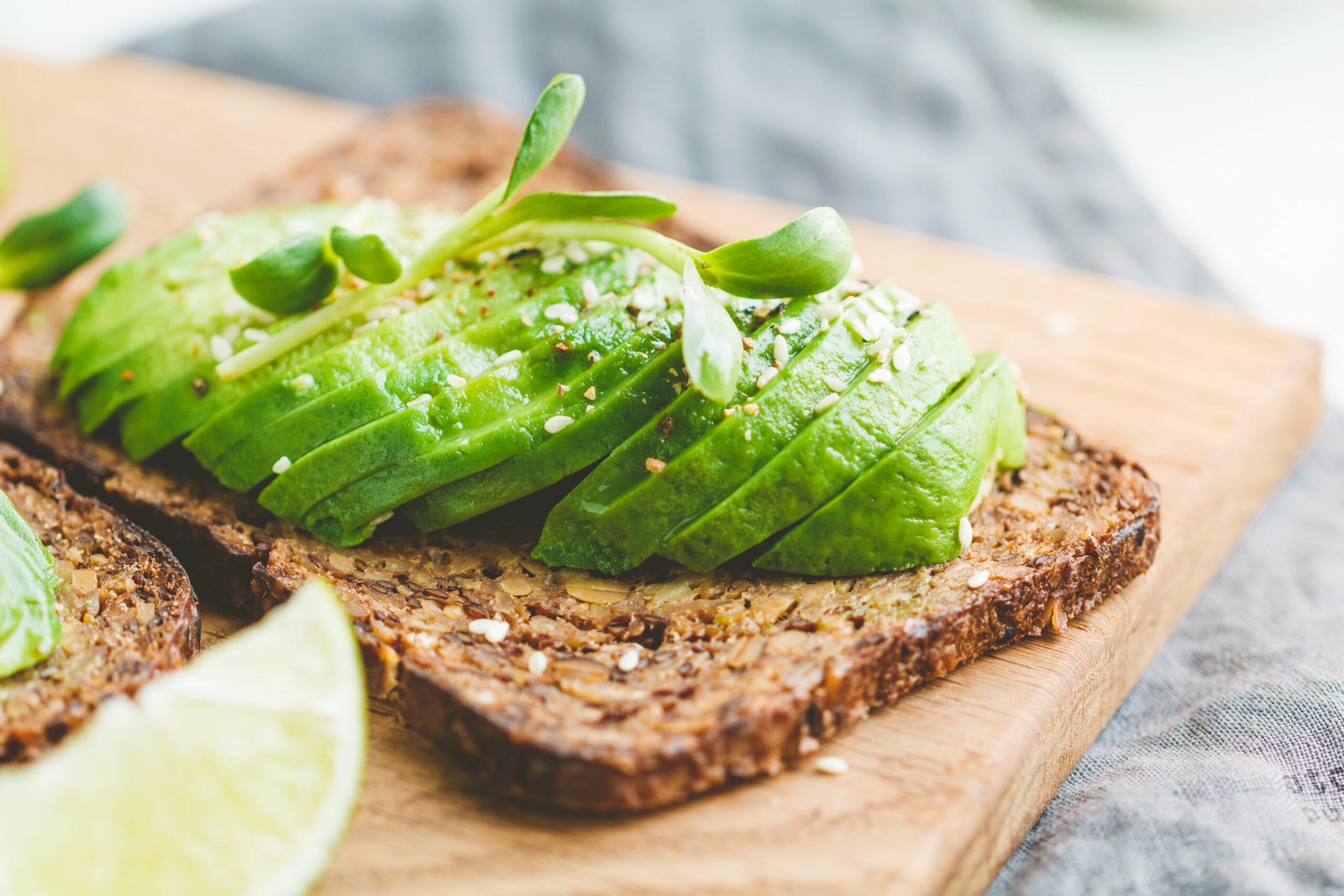 Otra idea es solo poner las rebanadas de pan de centeno con aguacate en rodajas y poco de zumo de limón exprimido por encima. El limón combina muy bien con el aguacate, aunque si lo prefieres también puedes usar lima. Añade además, unas pequeñas semillas de sésamo o de lino por encima de las tostadas de pan de centeno.