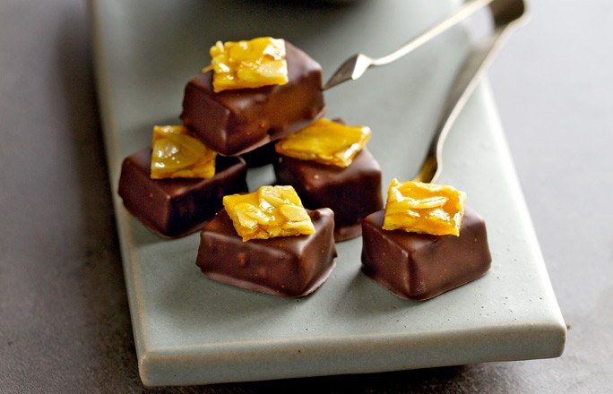 Los bombones de corte quedarán impresionantes si consigues darles un brillo especial. Esto se consigue cuidando la temperatura de fusión: funde el chocolate dentro de un recipiente sumergido en agua hirviendo y deja que se derrita lentamente, removiendo constantemente. A continuación, deja que el chocolate se enfríe muy despacio y después vuelve a calentarlo hasta una temperatura de 30 ºC. Así conseguirás que los bombones adquieran brillo y su aspecto sea de lo más apetecible. Otra manera de adornarlos: una vez sumergidos en chocolate, espolvorear con alguno de los miles de adornos que existen como pan de oro, perlitas de chocolate, virutas de colores… ¡Las posibilidades son infinitas! |