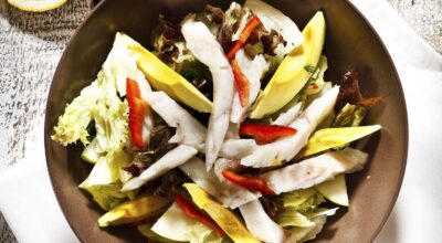 Aparte, partimos los aguacates por la mitad y retiramos el hueso. En el hueco que quede, agregamos el pollo que hemos preparado. Cuando tengamos esto listo, nos ponemos manos a la obra con la salsa de cilantro. Para ello, vamos a mezclar en un bol la leche de coco, el zumo de cuatro limas pequeñas y el cilantro bien picado y removemos bien. Cuando tengamos la salsa lista, la agregamos encima de los aguacates con pollo. ¡Una auténtica explosión de sabores!