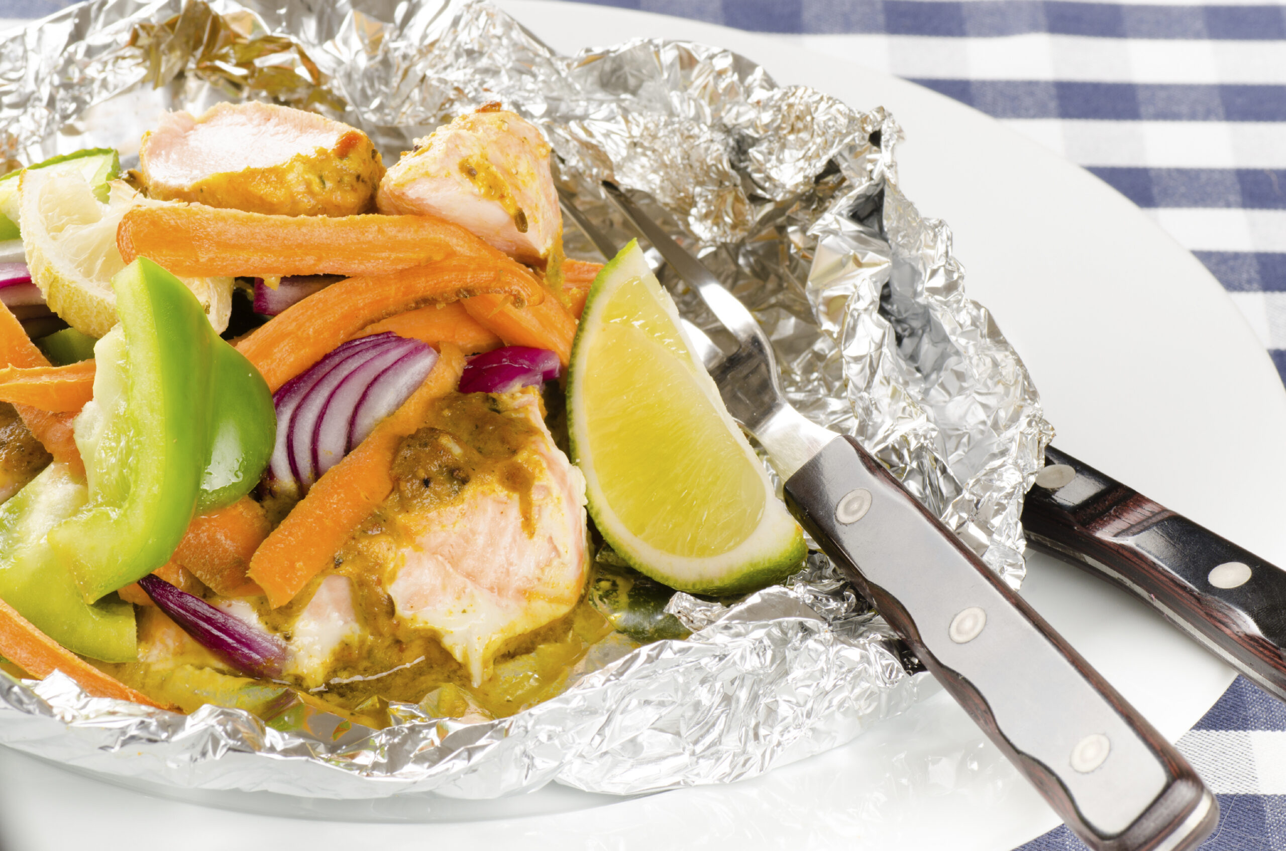Salpimienta los filetes de salmón y coloca cada uno en el centro de un trozo de papel de aluminio distinto. Colócalos en una fuente y vierte sobre ellos una cuchara sopera de aceite, una ramita de tomillo, media cebolla en aros, las zanahorias y los pimientos. Cierra el papel de aluminio de manera que quede cada uno en forma de paquete y colócalos en el borde de la parrilla (el pescado no necesita tanto calor como la carne). Deja que se calienten durante unos 30 o 40 minutos. ¡Y a disfrutar!