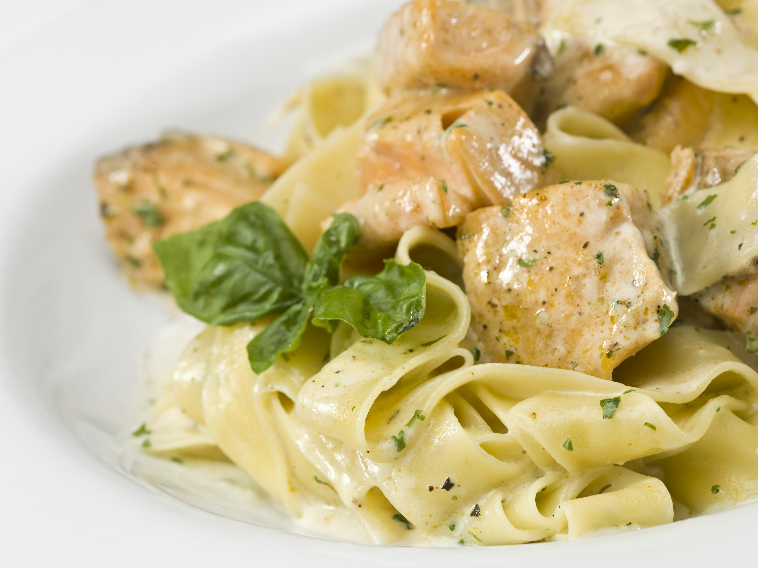 Mientras tanto, hierve la pasta siguiendo las instrucciones del paquete, para que quede al dente. Echa las hojas de albahaca en la sartén, mézclala con la nata (sin dejar que se siga haciendo) y salpimienta al gusto. Escurre la pasta, mézclala con la salsa y sírvela. También puedes añadir el queso parmesano rallado.