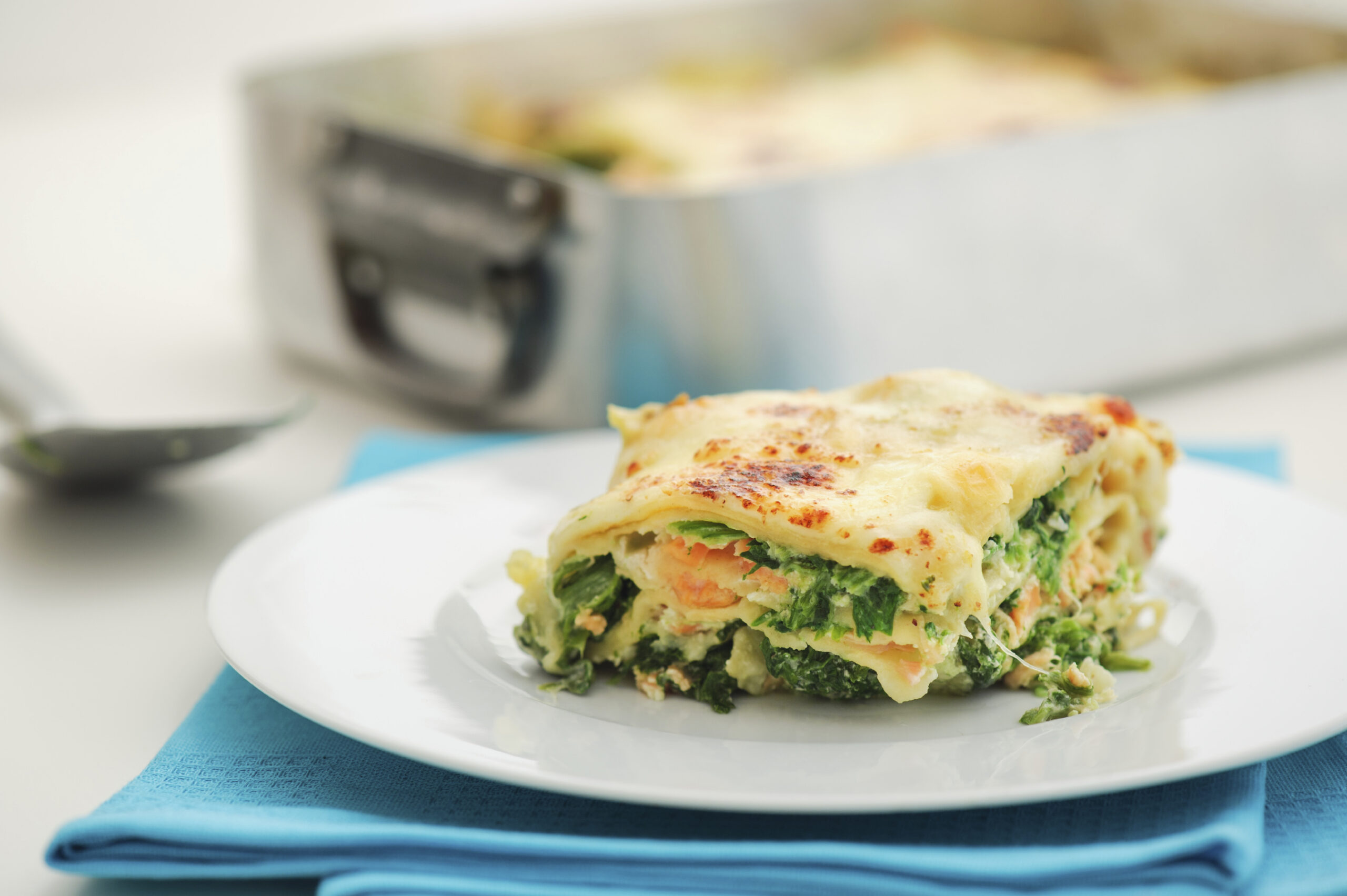 Precalienta el horno a 200 ºC y prepara un molde para la lasaña que sea apto para hornos. Vierte el aceite en una sartén, sofríe las cebollas, añade el salmón y deja que se fría para poder desmenuzarlo. Salpimienta y déjalo aparte.