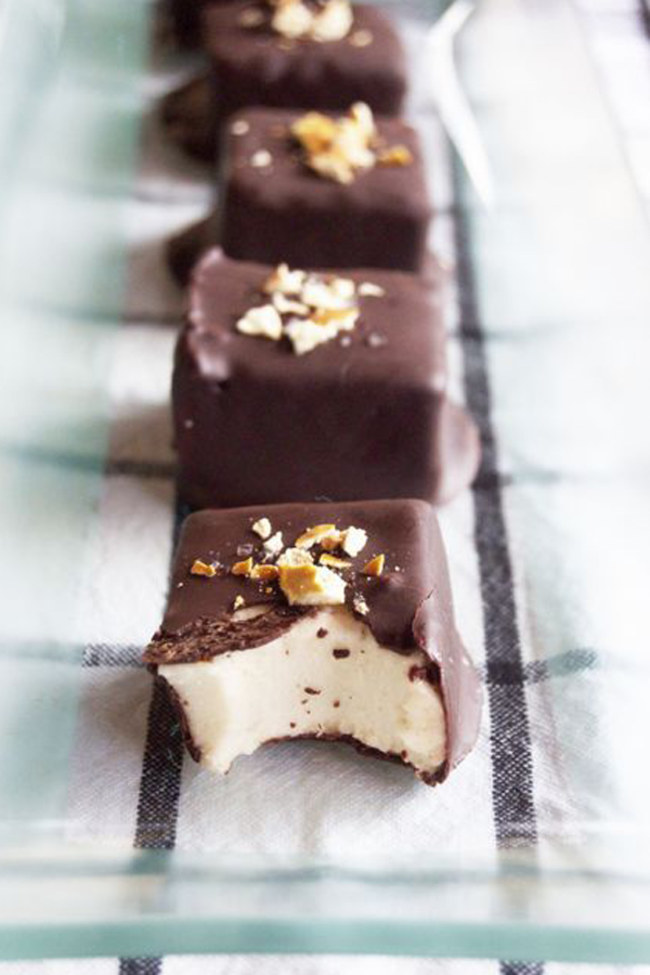 Mientras tanto, vamos a derretir el chocolate con aceite al baño maría. Cuando lo tengamos listo, cortaremos en cuadradillos el malvavisco resultante e iremos impregnando uno a uno cada bombón. Después, dejaremos que el chocolate se endurezca y agregaremos los prestes y sal gruesa para decorar. ¡Listo para degustar!
