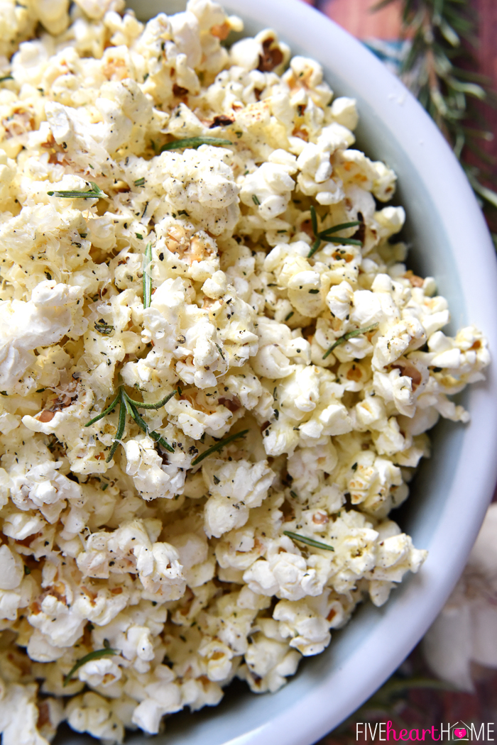 Colocamos las palomitas en un bol y añadimos el aliño de ajo y romero que ya estará frío. Agregamos también la sal, la pimienta y el queso parmesano rallado y removemos bien con las manos para integrar todos los sabores.