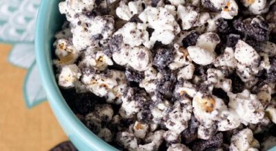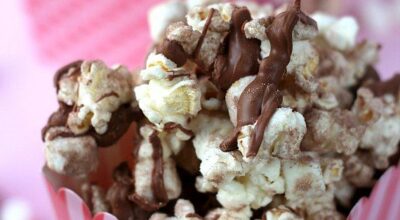 Mientras tanto, vamos a derretir al baño maría y por separado los dos tipos de chocolate. Una vez que saquemos las palomitas del horno, añadimos los chocolates con la ayuda de una cuchara, cruzando la bandeja de lado a lado rápidamente, para que simulen el estampado de una cebra. Dejamos que el chocolate se endurezca y… ¡A disfrutar!