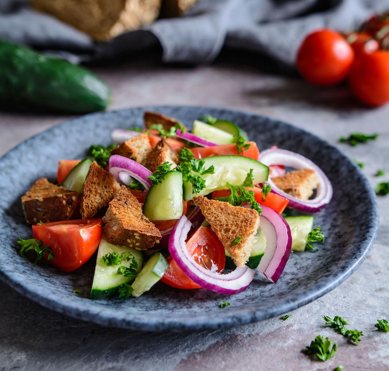 Mientras tanto, lava el pepino y los tomates. Corta los tomates por la mitad y haz lo mismo con el pepino. La cebolla, mejor en dados. Introdúcelo en la ensaladera o en el recipiente que más te apetezca. Después, enjuaga el perejil, sécalo y pícalo. Pica también el ajo y mézclalo con el perejil y el aceite para hacer el aderezo. Por último, sazónalo con sal y pimpienta.