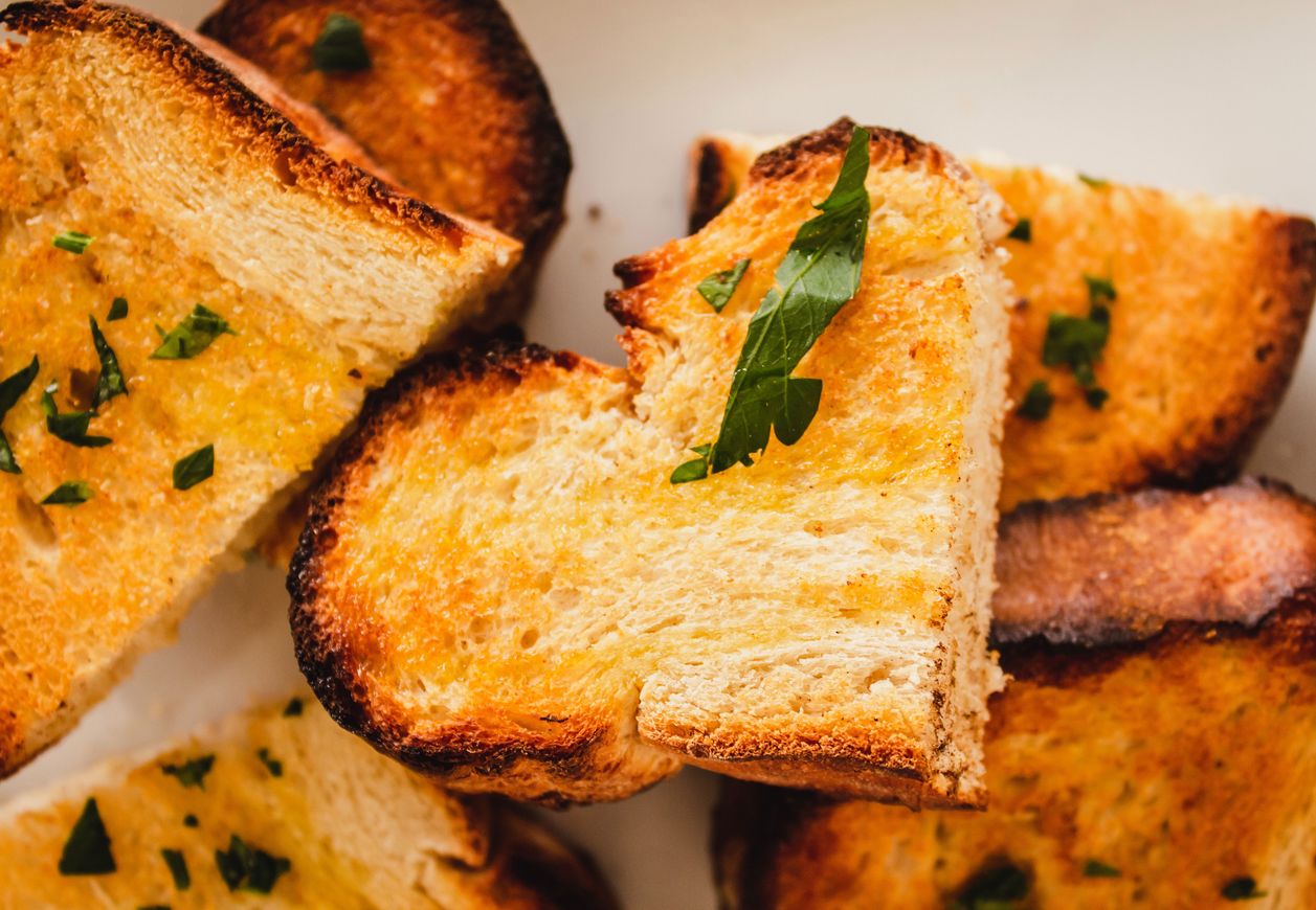Lo primero que debes hacer es derretir la mantequilla en una sartén. Después, pela un ajo y añádelo a la sartén. Corta el pan en rodajas muy finas y fríelo por ambos lados para que quede bien impregnado de la mantequilla y el ajo.