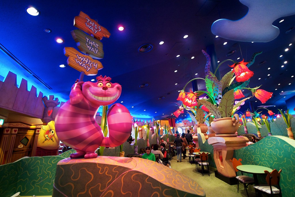 El restaurante está situado en Tokio y las salas se dividen en seis áreas temáticas en relación a las escenas de la película. Los menús están dedicados a los personajes del film y la comida la traen directamente y sin intermediarios desde el maravilloso “Wonderland”. ¿Atravesamos el espejo?