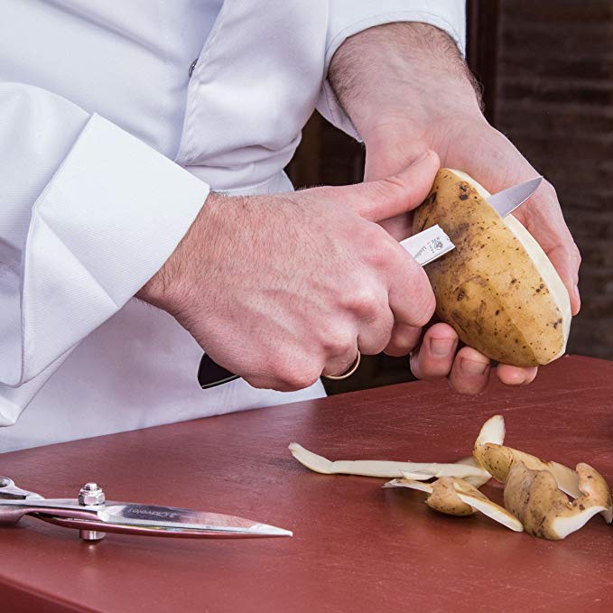 Cuchillo de pelar: El más pequeño y el más usado. Su hoja es puntiaguda, un poco ancha y sirve para cortar cebollas, manzanas, patatas, zanahorias y otras frutas y verduras.
