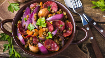 Otra de las mejores formas de consumir las ensalada de legumbres es en versión templada. Para ello, te sugerimos que poches cebolla morada, ajo, zanahoria y unas láminas de jamón serrano. Aunque no sea una receta demasiado veraniega, sí que se trata de una ensalada de legumbres realmente deliciosa y bien cargada de todo tipo de proteínas. Además, es una receta perfecta para los más peques de la casa porque el jamón camuflará el sabor de las lentejas.