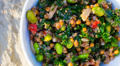 Si además de la legumbres introduces en tus ensaladas algunos superalimentos, conseguirás una receta de lo más completa. Esta que te presentamos a continuación incluye garbanzos, kale, quinoa, guisantes y otras verduras. A la hora de aliñar decídete por el aceite de oliva e incorpora sal. Si te apetece algo que tenga un sabor algo más intenso, prueba con un chorrito de limón y algo de pimentón picante. ¡El resultado será delicioso y realmente te llenará de energía!