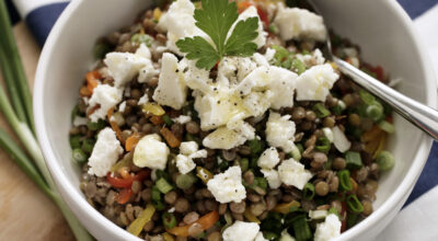 Si eres de las que es feliz con cualquier ensalada que incluya queso, tienes que probar esta que te presentamos a continuación. En ella, el queso feta, las aceitunas negras y el orégano son los protagonistas indiscutibles. Como imaginarás, la combinación de estos tres ingredientes aporta un toque muy griego que, junto a las lentejas, conforma un plato de lo más saludable. Para el aliño, bastará con un buen aceite de oliva. ¿A qué esperas para prepararla en casa?