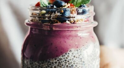 Semillas de chía con frutos rojos, plátano, menta y granola.