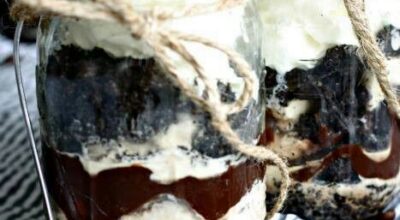 Postre de helado, nata, café y galletas Oreo.