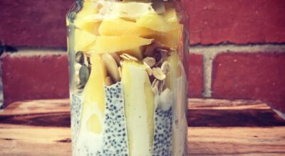 Semillas de chía con leche de avena y mango.
