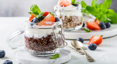 También puedes incluir la quinoa en tu desayuno. Pon en un tarro quinoa del tipo que más te guste, nosotras hemos cogido la roja. Esparce por encima yogur natural y coloca trozos de frutas. En este caso hemos utilizado frutos rojos, ya que es la época, y lo hemos completado con unas hojas de menta. ¡Delicioso!