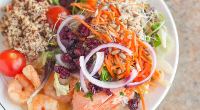 Si quieres un plato más consistente pero no te apetece comer carne, seguro que éste plato hecho con pescado te gusta más. Es similar a la ensalada mixta. Añade a la quinoa zanahoria, cebolla, cherrys, arándanos, canónigos, soja, algunas semillas que te gusten, gambas y salmón. Puedes hacerlo a la plancha o al vapor, pero para que sea más jugoso puedes hacerlo al horno con un poco de aceite, vino blanco y zumo de naranja, que da un buen toque y ayuda a digerir mejor los pescados grasos como el salmón. Después lo añades a la mezcla que hemos hecho con toda la verdura que hemos nombrado y resultará un plato delicioso.