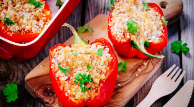 Una versión de los típicos pimientos rellenos pero más saludables. Mezcla quinoa con queso tipo feta, cebolla y tomate y póchalo un poco. Mientras, se hornean los pimientos abiertos en el horno. Cuando estén casi hechos, los sacamos, rellenamos con la mezcla que hemos preparado, rayamos un poco de queso cheddar por encima y lo volvemos a meter en el horno. Cuando veamos que está gratinado lo sacamos y a comer.