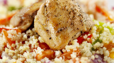 Si quieres que la quinoa forme parte del acompañamiento y no del plato principal, ésta es tu receta. Asa unos muslos de pollo al horno. Puedes hacerlo con un poco vino blanco, aceite, sal y pimienta. Si quieres echarle alguna otra especia como romero eres libre de hacerlo. Prepara una rica ensalada con cebolla, pimiento, tomate y, por supuesto, quinoa. Cuando el pollo esté hecho, colócalo encima y disfruta.