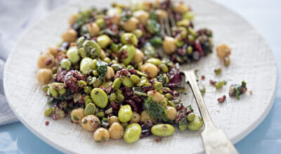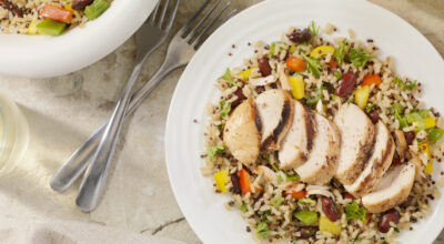 Una receta muy completa. Añade a la quinoa frijoles, garbanzos, arroz negro, arándanos y un poco del súper alimento kale. Mézclalo todo con una salsa hecha a base de mora y menta. ¡Buenísimo!
