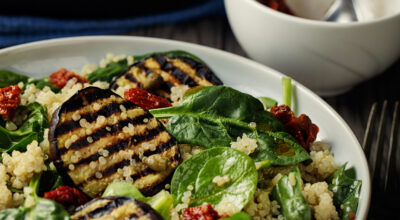 Un plato un poco más consistente. Haz a la plancha rodajas de berenjena. Añade tomates secos y mézclalo en un plato junto con la quinoa y hojas de espinaca. Con un chorro de buen aceite un plato perfecto.