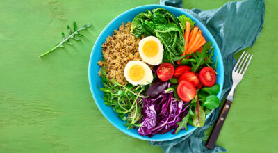 ¿Te apetece una ensalada completa y fresquita? Pues este es tu plato. Cuece un huevo y trocéalo. Pon en un bol la quinoa, el huevo, zanahoria, cherrys, radicchio, kale y varios tipos de verdura de hoja verde o brotes, como canónigos, lechuga, rúcula, acelga... lo que prefieras.
