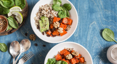 Cuece un poco de calabaza y hazla trozos. Mézclala en un plato con espinacas, nueces, aguacate y por supuesto la quinoa. Como en otros platos, te aconsejamos que lo adereces con lima.