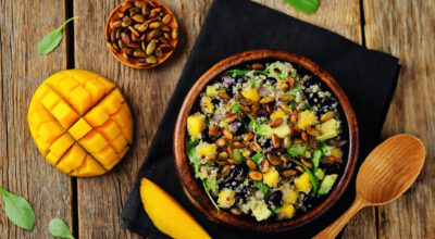 Una ensalada rica y completa. Añádele a la quinoa un puñado de habas, rúcula o espinacas, semillas de calabaza, aguacate y la estrella del plato: mango troceado. Adereza con limón y disfruta.