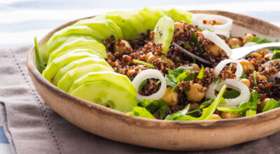 Si te gusta el pepino te gustará este plato. Cuece unos garbanzos con espinacas. Cuando esté hecho, mézclalo con quinoa roja y añade tantas rodajas de pepino como quieras y cebolleta. Te encantará.