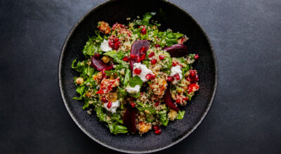 Un plato más denso. En una sartén con una gota de aceite saltea la quinoa con un poco de remolacha, un puñado de espinacas y pimiento rojo. Sácalo y añade unos granos de granada y unos trozos de mozzarella. Remueve y ¡listo!