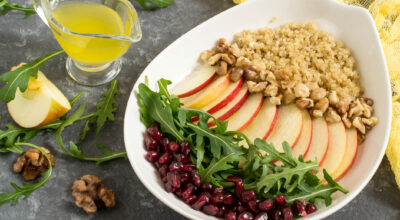 Un plato rico donde los haya. Dispón en un plato quinoa, nueces, manzana troceada, rúcula y granada. Puedes aderezar con un poco zumo de limón. Una receta perfecta para el otoño.